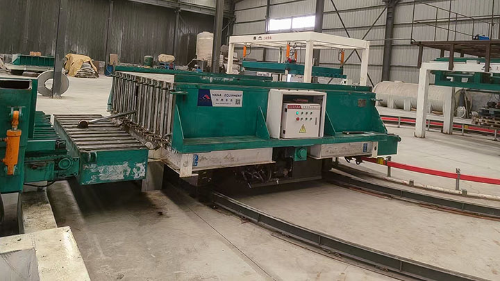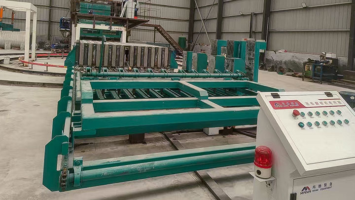 出板系統由出板機與翻板機組成。出板機采用一次拖板設計,配備變頻驅動裝置,具有拉力大、運行平穩、效率高等優點。取出的板材可通過液壓系統實現自動合攏。翻板機通過液壓驅動,將墻板旋轉90度,并自動將板材與鋁合金底模分離,隨后再進行第二次90度翻轉,完成出板全過程。