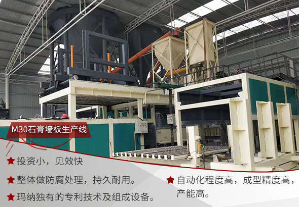 M30石膏墻板自動化生產線是鄭州瑪納引進國外最先進的石膏墻板生產工藝,經過創新研發成功的針對石膏類隔墻板生產的裝備。生產的石膏隔墻板具有成型精度高、強度高、 質量優、 耐水、 防火、 抗震、防潮、 產品綜合成本低等特性,很多性能標準優于現行的標準,是完全符合墻改政策的新型裝備。