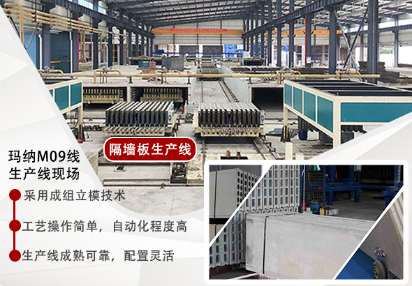 鑒于這種情況瑪納公司研制開發了M09輕質隔墻板機械設備,其特點是:結構簡單、配套設備少、價格符合市場行情,適用于大中小企業。大大減少了工人的勞動強度,節約了材料、降低了生產成本、提高了勞動生產率,提高了產品的質量。墻板經流水線澆注、整平、科學養護而成,生產自動化程度高,規格品種多。最重要的是,生產的輕質隔墻板可根據用戶需要,長度任意切割,且性能良好。