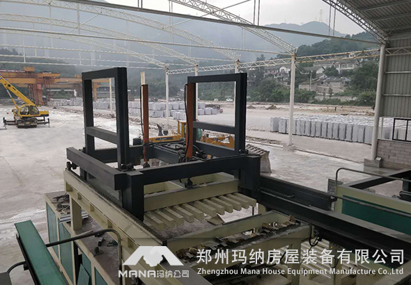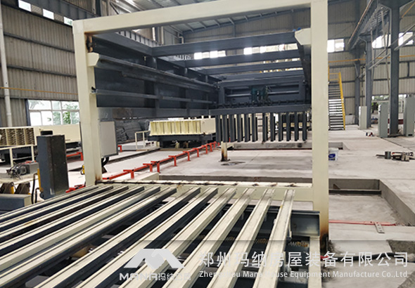 開模完成后,由推板出板機把成型墻板推出到合板翻板機,6塊為一組合攏在一起,打包。由叉車運出成品堆場。
