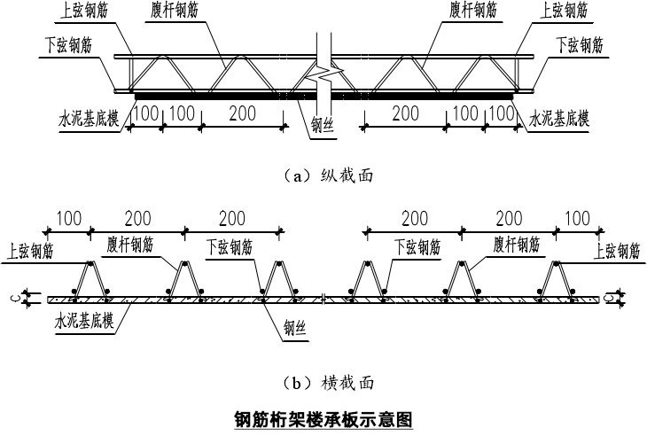 鋼筋桁架樓承板的縱截面示意圖和橫截面示意圖。
