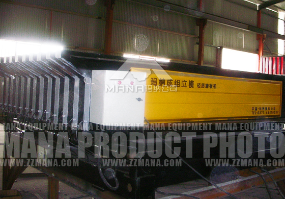 瑪納公司已研制開發出兩大系列成組立模生產設備,即機動式成組立模和機械成組立模機組,成組立模技術的應用范圍也由制造輕混凝土隔墻板發展為制造普通混凝土隔墻板和各種構造型式的復合墻板。機動式成組立模與拆裝式成組立模相比有了本質的飛躍,采用了自動開合模、自動控溫加熱、長度與厚度可調、多模腔連續張網、導向穿拔芯管等項技術。依靠設備本身的技術特點和與之配套的有效工藝措施,使墻板的各項技術性能大為提高。用于制造輕混凝土類圓形孔洞空心隔墻板。