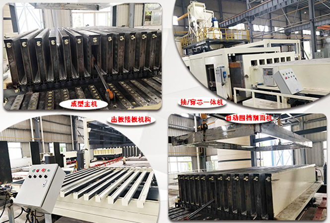 M30石膏墻板生產(chǎn)線設(shè)備組成:成型主機(jī)—可靈活配置,數(shù)量決定產(chǎn)量;抽/穿芯一體機(jī)—一次性液壓自動穿管,自動液壓抽管;出板接板機(jī)構(gòu)—出板、接板,方便打包運(yùn)輸;上成型機(jī)—液壓自動下壓,震動,上面成型;自動圍擋刮面機(jī)—布料時,自動放置圍擋,避免濺料,布料后,自動刮平漿料。