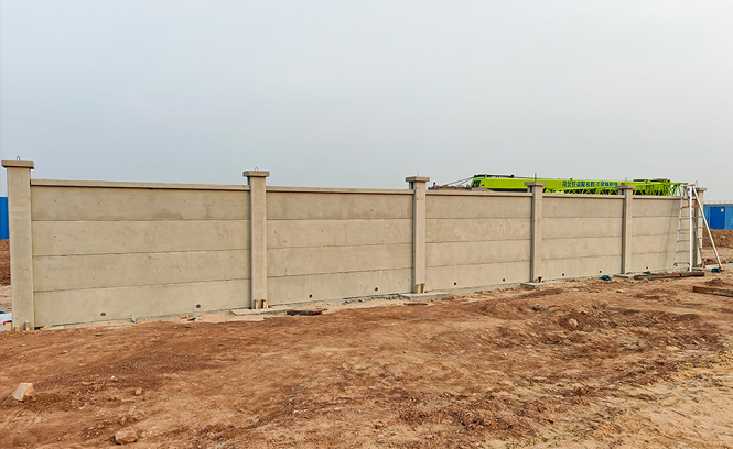 裝配式圍墻一般由柱、墻板、壓頂和柱帽構(gòu)件組成,所有構(gòu)件采用工廠預(yù)制。基礎(chǔ)施工完成后,上部預(yù)制構(gòu)件按立柱-插板-壓頂-柱帽現(xiàn)場裝配,裝配過程由中、小型吊裝設(shè)備完成,施工方便。